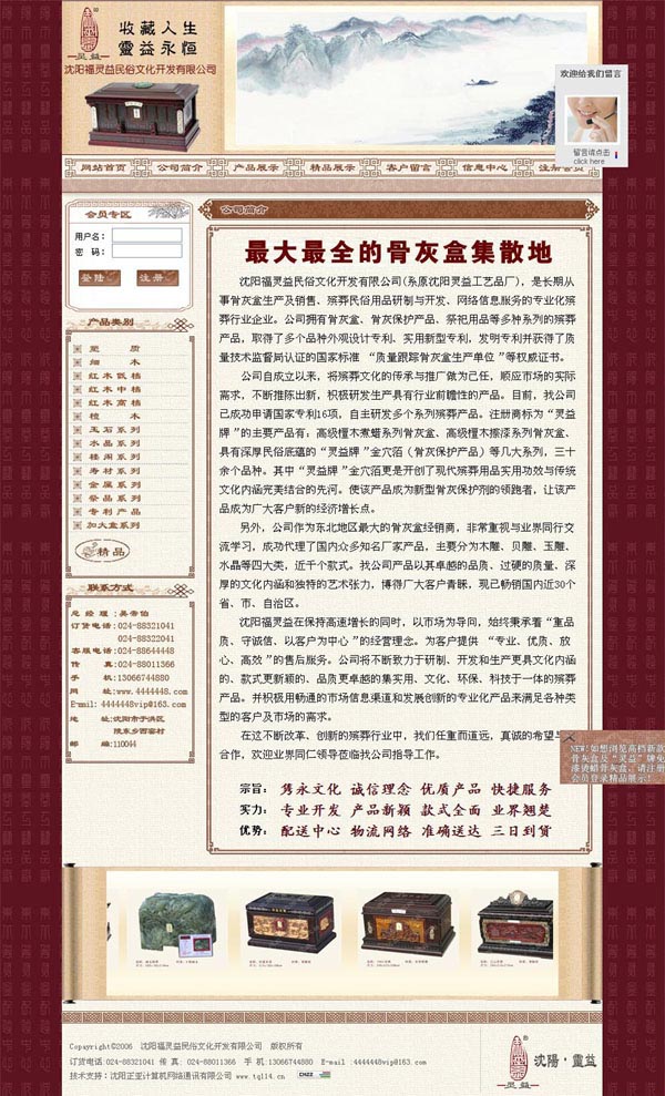 沈陽福靈益民俗文化開發(fā)有限公司(系原沈陽靈益工藝品廠),是長期從事骨灰盒生產及銷售、殯葬民俗用品研制與開發(fā)、網(wǎng)絡信息服務的專業(yè)化殯葬行業(yè)企業(yè)。公司擁有骨灰盒、骨灰保護產品、祭祀用品等多種系列的殯葬產品,取得了多個品種外觀設計專利、實用新型專利,發(fā)明專利并獲得了質量技術監(jiān)督局認證的國家標準 “質量跟蹤骨灰盒生產單位”等權威證書。